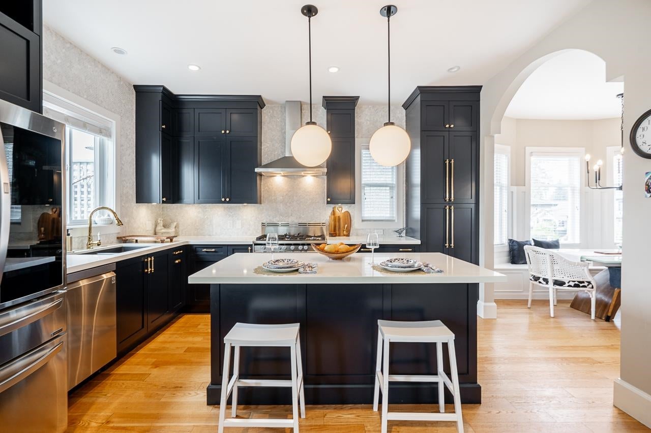 Featured on LOVE IT OR LIST IT VANCOUVER and in Style at Home, this beautifully updated character home blends timeless charm with modern upgrades in sought-after Central Lonsdale. Offering three finished levels, including a bright open-concept main floor with updated chef’s kitchen, quartz counters and premium appliances, two gas fireplaces, and seamless indoor-outdoor living to a large south-facing deck with city views. Upstairs includes two spacious bedrooms plus a skylit office nook, while the fully finished basement with separate entry, new bathroom, and kitchen rough-ins offer suite potential. The private backyard is a rare retreat with mature fruit trees, vegetable garden, pergola, and hot tub. High efficiency Furnace and On-demand H/W. Quiet Street. Open House SAT 2-4pm.